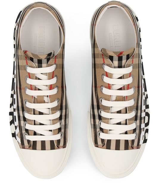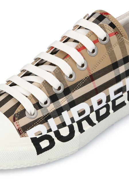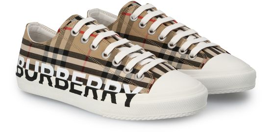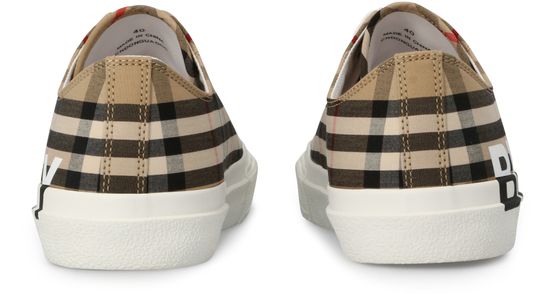 The Burberry logo stands out in a contrasting color on the sole and bottom of the Larkhall lace-up sneakers, which feature the British designer's tartan.