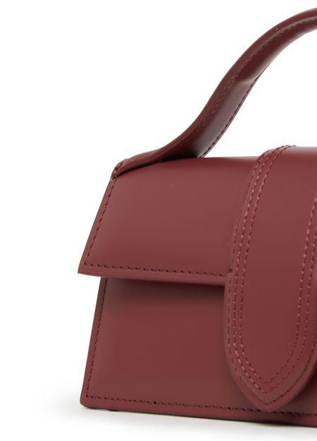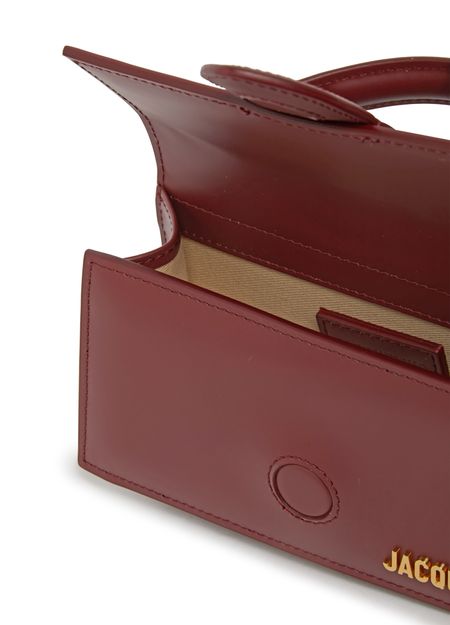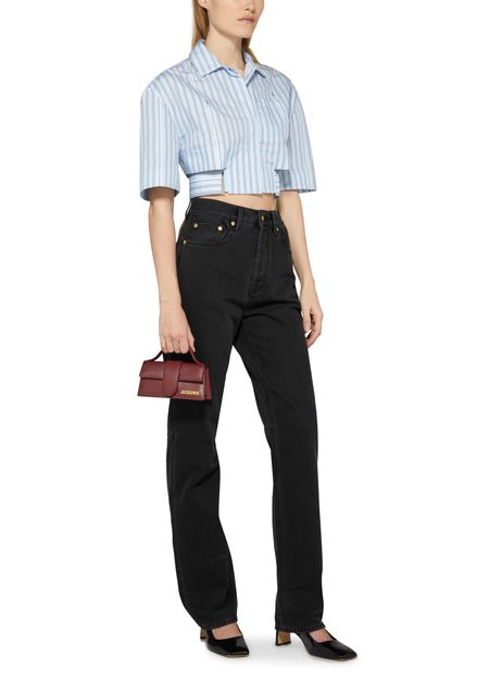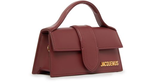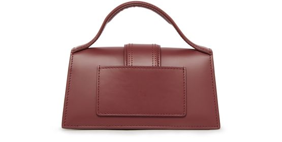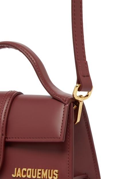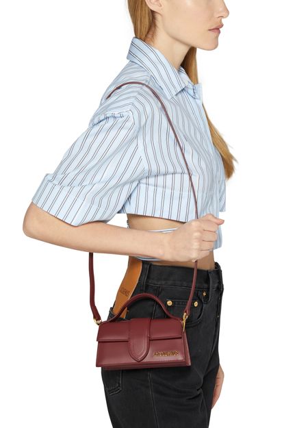 The Jacquemus Bambino bag, crafted from smooth leather, features a padded top handle and a removable shoulder strap for carrying by hand, over the shoulder, or across the body. The magnetic flap closure is adorned with the logo in gold lettering. An elegant and versatile accessory for any occasion.