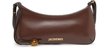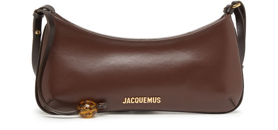 The Jacquemus Le Bisou Perle bag is a mini bag made of smooth leather. It features a handle and a logo in gold letters. This versatile bag can be worn in the hand or on the shoulder, making it perfect for any occasion.