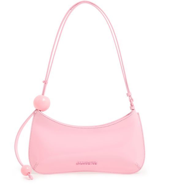 Jacquemus's Le Bisou Perle bag showcases a chic mini design, featuring a zipper closure and a front logo in gold letters. Its double handles and adjustable thin strap allow for versatile styling—hand carried or worn on the shoulder. Visible topstitching and a stunning gold finish elevate this statement piece.