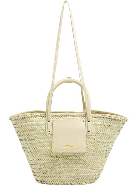 The Jacquemus Le Panier Soleil bucket bag is a stylish and versatile accessory. Made of basket material, it features two leather handles and a thin strap for hand carrying, shoulder wearing, or crossbody use. The bag is finished with a gold letter logo, adding a touch of luxury to its design.