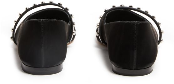Discover Alexander McQueen's leather ballerinas, crafted from smooth leather with a pointed toe and flat heel. The studded strap, combined with a logo on the side, adds an elegant touch. Perfect for fashion-forward individuals, these silver-finish shoes offer both style and comfort.