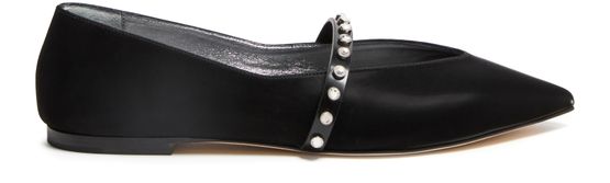• Description : Smooth leather, flat heel, pointed toe, studded strap, logo on the side, silver finish.