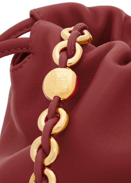 Loewe's Leather Flamenco Purse is a hand carried small bucket bag with a thin strap and single handle. It has a drawstring closure and magnetic closure for security. The single compartment is adorned with an appliquéd logo and gold letters. The front logo is printed for a sleek finish.
