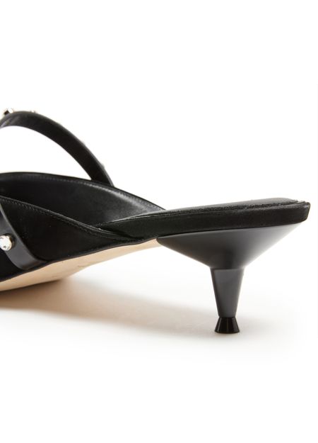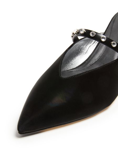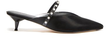 • Description : Smooth leather, low heel, spool heel, pointed toe, studded details, silver finish.