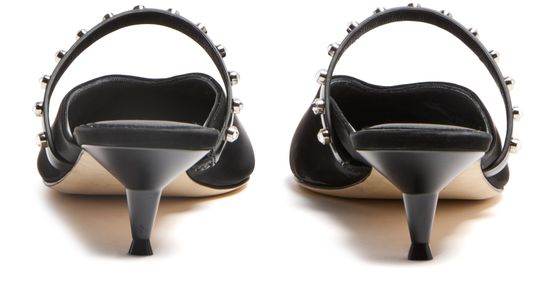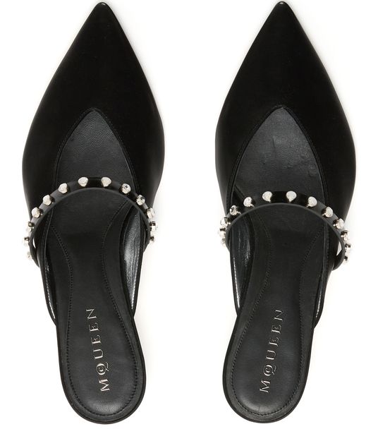 Unveil Alexander McQueen's mules crafted in smooth leather. These elegant shoes feature a pointed toe and a distinctive spool heel, adorned with studded details and a silver finish for a modern touch. The low heel ensures comfortable wear, making them the perfect choice for a stylish outing.