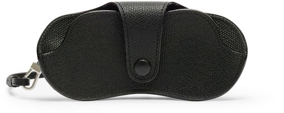 Reveal Valextra's leather spectacle case, crafted from grained leather with a refined metal finish. The detachable thin strap and visible stitching add a modern touch, while the snap-button fastening ensures secure storage. This piece blends functional elegance with signature Italian craftsmanship.