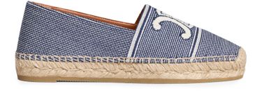 Reveal Celine's Les espadrilles Celine in striped textile with Triomphe. With an almond toe shape, these espadrilles boast a meticulously hand-stitched upper, seamlessly connecting to a durable rope and rubber outsole. The slip-on design complemented by a leather insole ensures both elegance and comfort.
