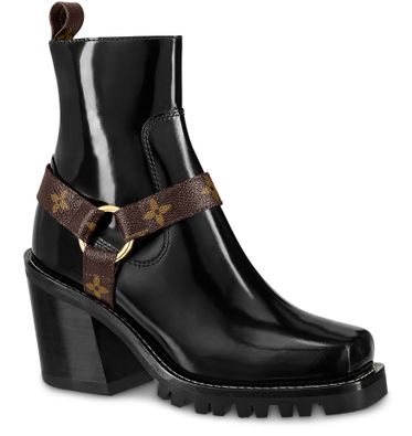 The Limitless ankle boot in black glazed calf leather is a go-anywhere style characterized by its sturdy heel and treaded rubber outsole. It is embellished with straps and a back loop in Louis Vuitton's iconic Monogram canvas, and features a side zip for practicality.
