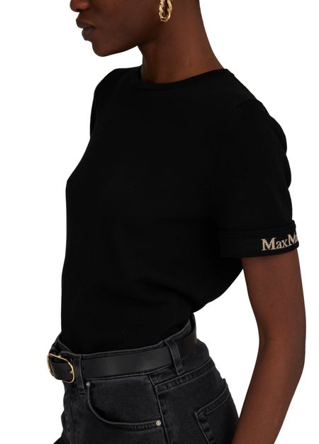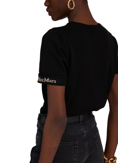 Max Mara's Limone striped t-shirt features a classic crew neck design with a logo on the side for a touch of sophistication. The striped print adds a stylish flair to this short-sleeved top, making it a versatile and chic addition to any wardrobe. Perfect for effortless, everyday style.