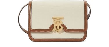 Description : Mini bag, adjustable, detachable strap, dual-material, flap closure, tB monogram clasp, visible contrast stitching, worn in the hand, on the shoulder or crossbody.