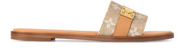 The iconic Lock It flat mule is reinterpreted this season in Monoglam canvas, coordinating with the leather goods collection. Its wide front strap is embellished with calf-leather trim and a gold-tone accessory inspired by the S-lock closure of historic Louis Vuitton trunks. A durable leather outsole completes this design.