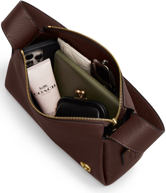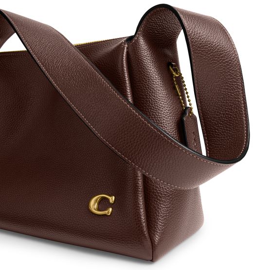Reveal Coach's Lola shoulder bag, crafted from grained leather with a single handle for effortless sophistication. The gold-finish hardware and iconic front logo add a refined touch, while the spacious interior compartment and secure zipper closure ensure both style and practicality.