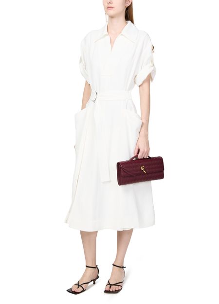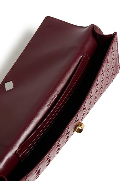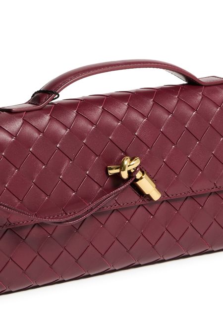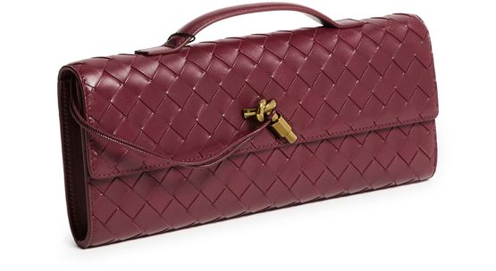 Bottega Veneta's Long Andiamo clutch with handle boasts a sleek design, perfect for hand carrying. Its flap closure secures your essentials, while the interior slots for cards keep you organized. The luxurious gold finish adds a touch of elegance, making it an ideal companion for any sophisticated outing.