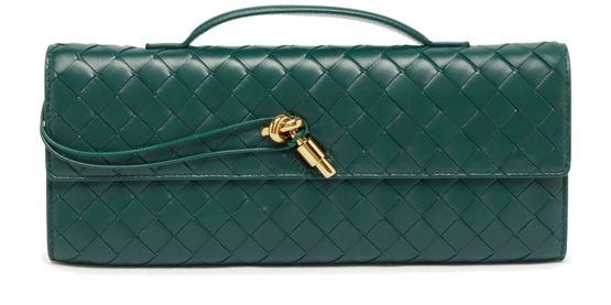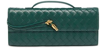 Bottega Veneta's Long Andiamo clutch with handle boasts a sleek design, perfect for hand carrying. Its flap closure secures your essentials, while the interior slots for cards keep you organized. The luxurious gold finish adds a touch of elegance, making it an ideal companion for any sophisticated outing.