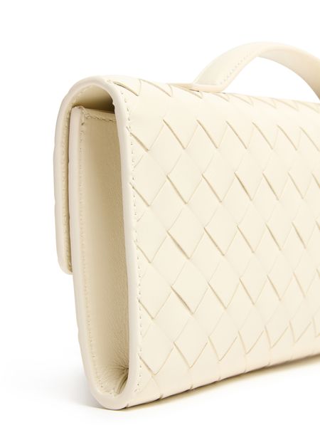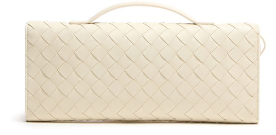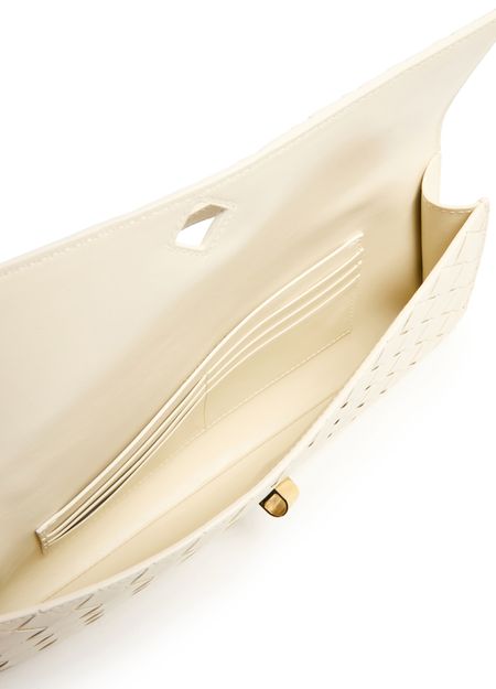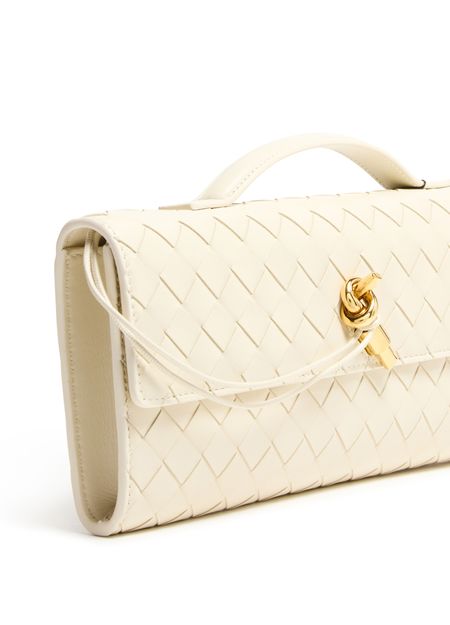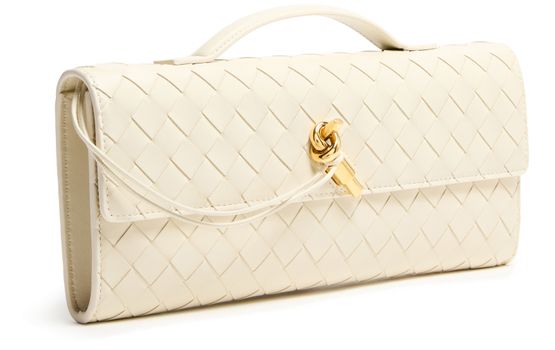 Bottega Veneta's Long Andiamo clutch with handle boasts a sleek design, perfect for hand carrying. Its flap closure secures your essentials, while the interior slots for cards keep you organized. The luxurious gold finish adds a touch of elegance, making it an ideal companion for any sophisticated outing.