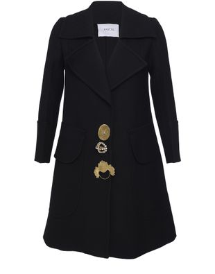 Patou offers an elegant black coat with a vintage feel, which gives a contemporary, couture look and slim build.