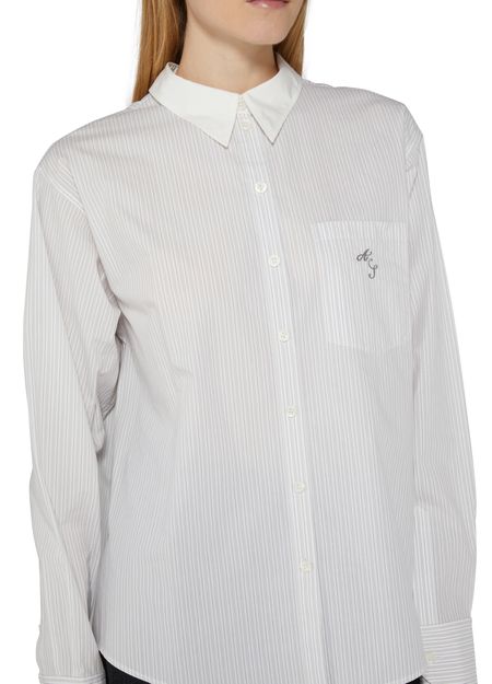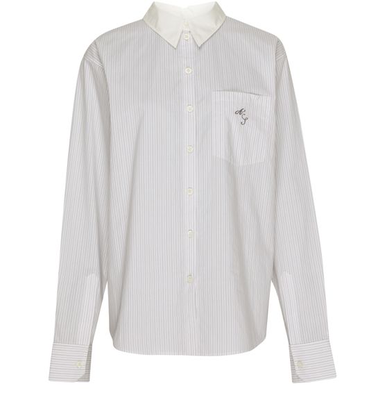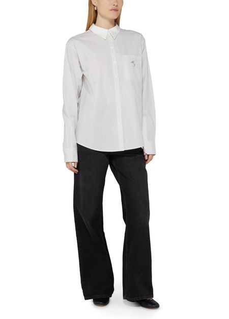 This long-sleeved blouse by Acne features an embroidered chest logo and a front logo with a striped print. It has a buttoned closure and cuffed sleeves with a shirt collar. The logo is also embroidered on the back label. The button fastening adds a polished touch to this versatile and stylish piece.