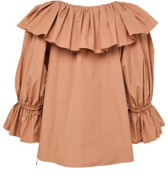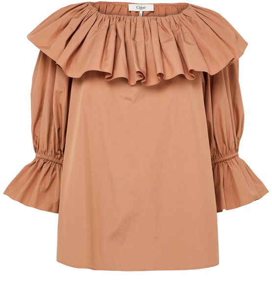 Reveal Chloé's long-sleeved blouse, featuring a refined round neck and distinctive ruffled sleeves. The fluid silhouette and delicate detailing offer a graceful touch, making this top a versatile choice for both casual and sophisticated ensembles.