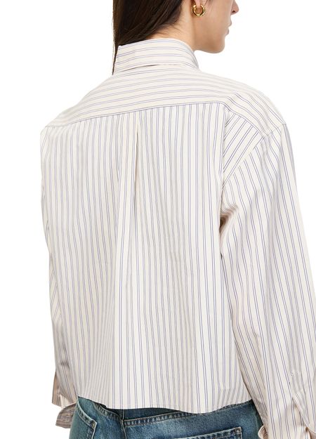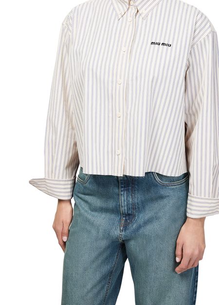Reveal Miu Miu's logo shirt, featuring a refined striped print and an embroidered chest logo for a signature touch. The button fastening and tailored silhouette offer a polished look, making this top a versatile choice for both casual and elevated ensembles.