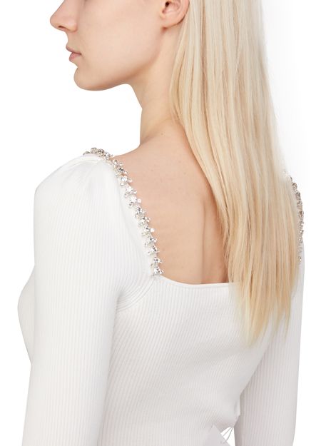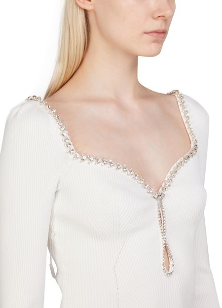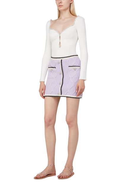 Self Portrait's long-sleeved top showcases a stunning neckline adorned with intricate bead details. Its slim-fitting silhouette elegantly accentuates the figure, while graphic cut-outs add a modern twist. Perfect for any occasion, this top combines sophistication with playful design, making it a must-have for the contemporary wardrobe.