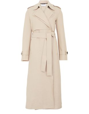 Harris Wharf's London Long trench coat is a timeless piece with a maxi length design. It features a belted waist, side pockets, and buttoned cuffs for a classic look. Made from a warm material, this coat is perfect for staying cozy and stylish during the colder months.