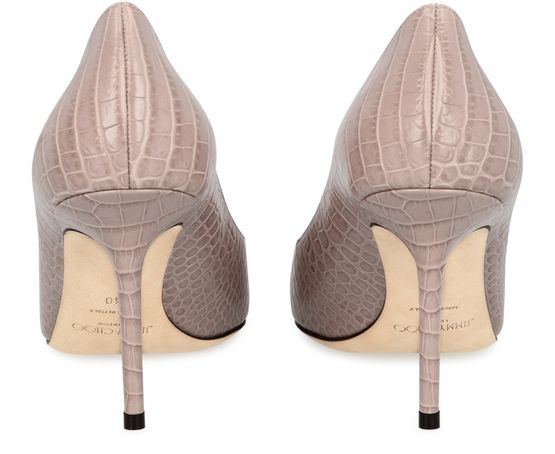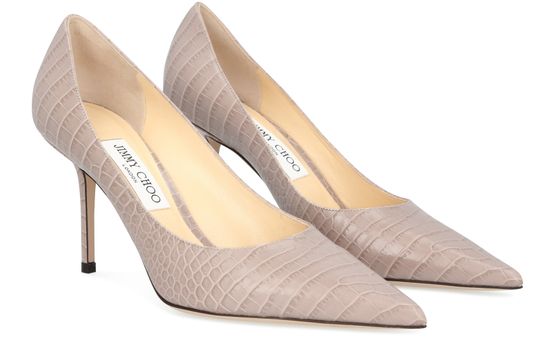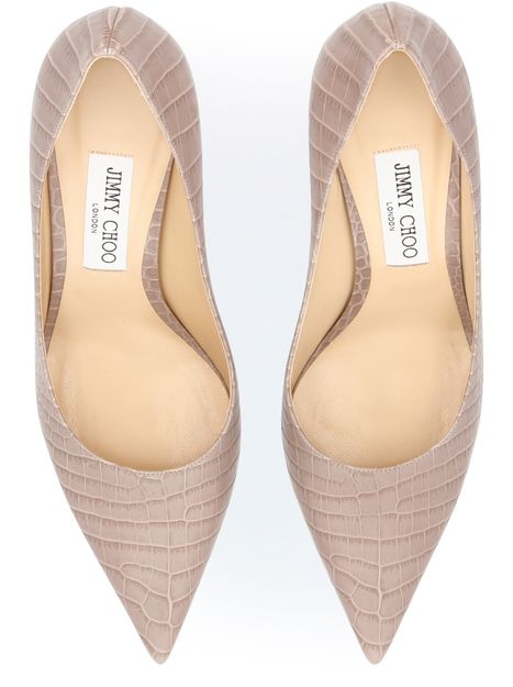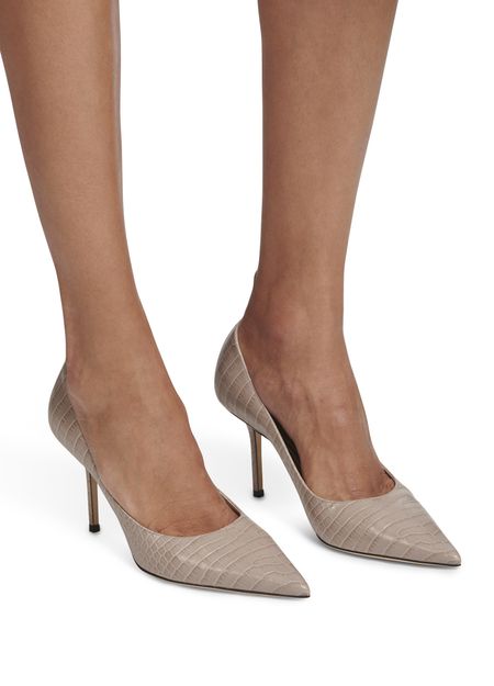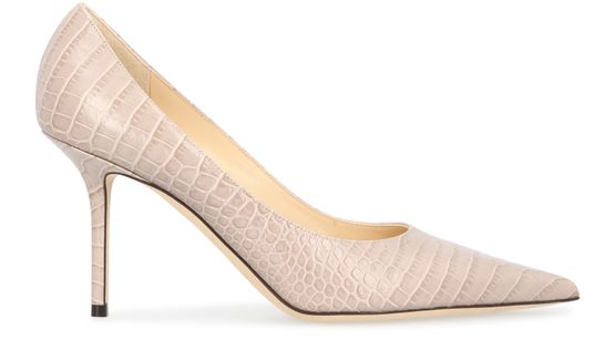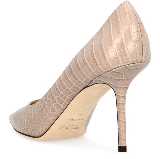 The smooth, shining leather of the Love 85 pumps has crocodile-style embossing that adds energy to their classic architecture. These pieces are by Jimmy Choo.