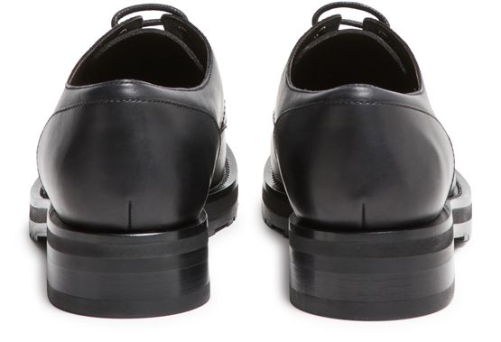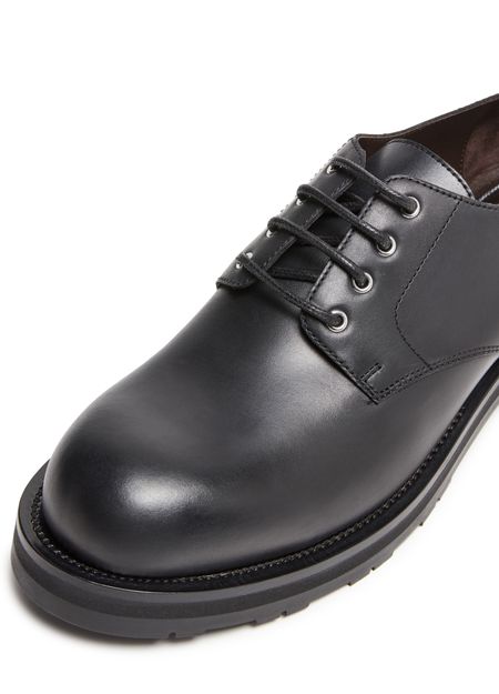 Reveal The Row's lug sole derbies in leather, crafted from smooth leather with a refined round toe and closed design. The low block heel and notched sole offer both comfort and modern edge, while visible stitching and a printed logo add signature detail. Laces and strap ensure a secure fit.