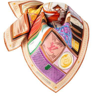 A masterpiece of contemporary design and craftsmanship, the new Malle Coiffeuse square pays homage to the House’s trunk-making legacy. Printed on pure silk, its colorful pattern is an intricately detailed depiction of a well-stocked beauty case packed with makeup, mirrors, fragrance bottles, combs… An exquisite, versatile accessory and a celebration of feminine elegance.
