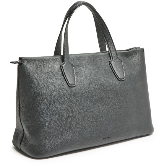 Reveal The Row's Marcel leather tote bag, crafted from grained leather with double handles for effortless carrying. The padded texture and visible stitching showcase refined craftsmanship, while a spacious interior and zippered pocket offer practical organization. An embossed logo adds a subtle signature touch to this modern essential.