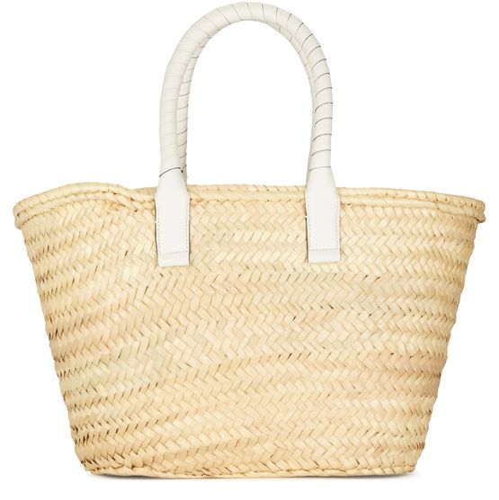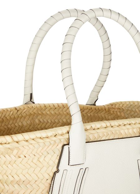 Description : Braided design, leather appliquéd embellishments, embossed logo, two leather handles, front pocket, large interior compartment, antique gold-toned metal finishes, worn in the hand or on the shoulder, artisanal craftmanship, basket sizing and details may vary.