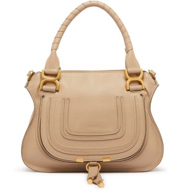 The Chloé Marcie double carry bag is crafted from grained leather and features a rolled leather handle and a slender adjustable, detachable shoulder strap. It has a zipper closure and a single compartment with a zippered interior pocket. The bag is finished with an embossed logo and gold finishes.
