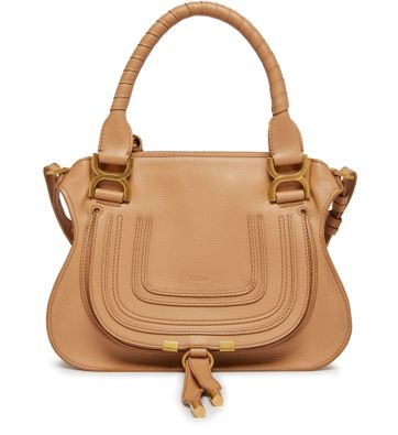 The Chloé Marcie double carry bag is crafted from grained leather and features a rolled leather handle and a slender adjustable, detachable shoulder strap. It has a zipper closure and a single compartment with a zippered interior pocket. The bag is finished with an embossed logo and gold finishes.