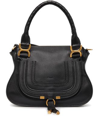 The Marcie handbag from Chloé features leather bound handles and a detachable strap for versatile carrying options. It has a zipper closure, visible stitching, and an embossed logo for a signature touch. The gold finish adds a touch of luxury. The bag can be hand carried, worn on the shoulder, or across the body for added convenience.
