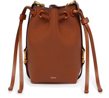 The Marcie bucket bag from Chloé features a versatile design with a chain strap for wearing on the shoulder or hand carried with the single handle. The gold finish hardware and logo in gold letters add a touch of luxury. The printed logo and drawstring closure provide a stylish finish, with a detachable strap for added convenience.