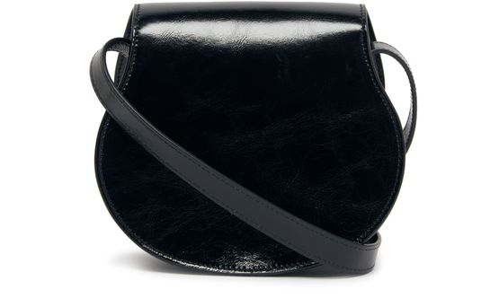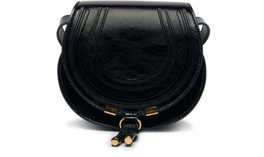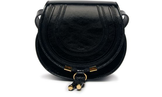 Chloé's Marcie small glossy leather shoulder bag features a front logo and engraved logo, visible topstitching, thin strap for wearing crossbody, single handle with gold finish, single compartment with flap closure, front pocket, and leather handle.