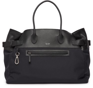 The Row Margaux 17 inside-out bag is a stylish and practical accessory for any fashion-forward individual. With two handles and a drawstring closure, this bag is perfect for carrying all your essentials. It also features an exterior patch pocket, zippered front pocket, visible stitching, carabiner, and a logo in gold letters. The bag can be worn in the hand for a chic and sophisticated look.