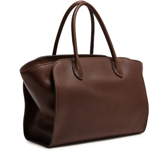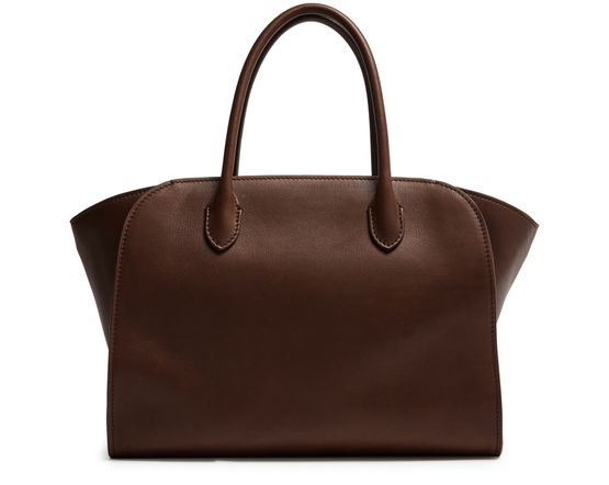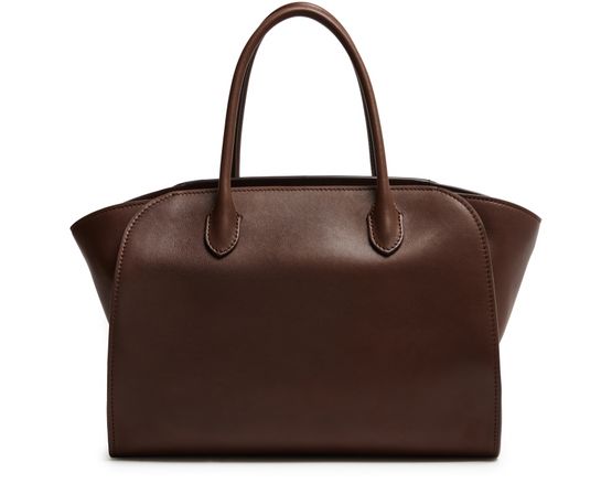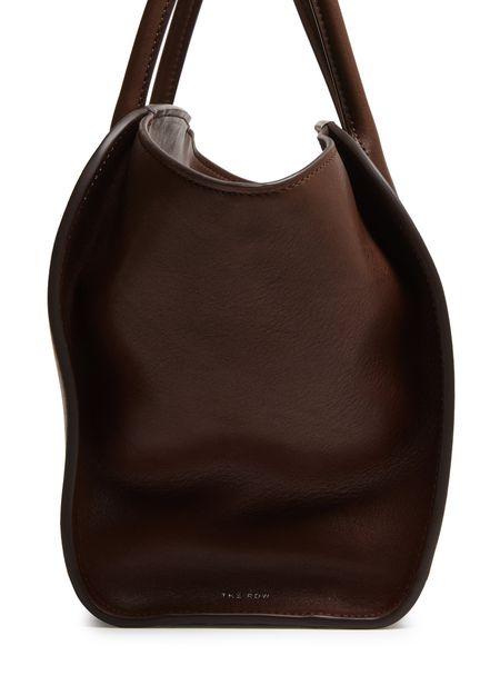 Reveal The Row's Marlo 12 tote bag, crafted from smooth leather with double handles for effortless carrying. Visible stitching and a spacious interior with a zippered pocket combine style and practicality, while a secure zipper closure and fabric lining complete this modern essential.