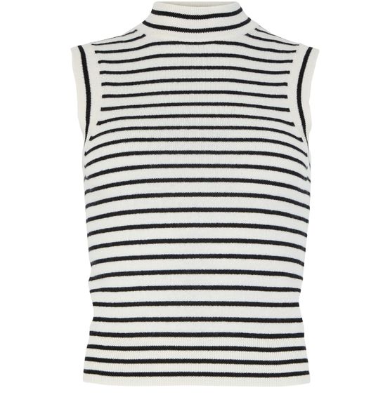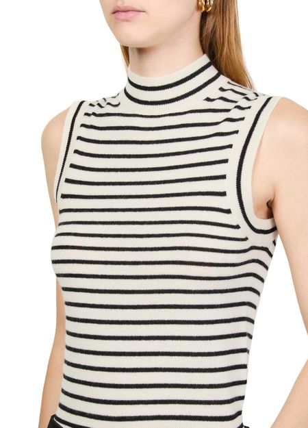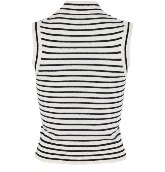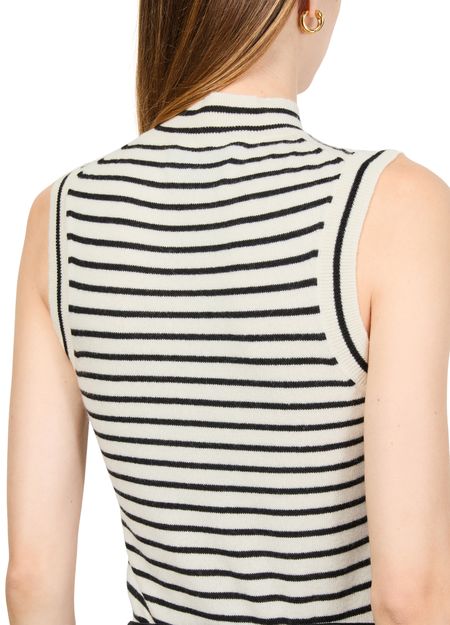 Unveil Nili Lotan's Masha sweater tank with its sleek, striped print. The mockneck and sleeveless cut create a slim fit, while the cropped design adds a contemporary edge. Perfect for layering or wearing alone, this versatile piece elevates any wardrobe.
