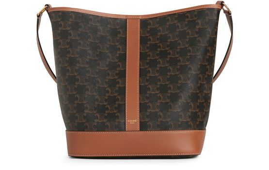 Celine's Medium bucket bag in Triomphe canvas is a stylish companion for any occasion. With a soft textile lining, it effortlessly transitions from crossbody to shoulder bag. The snap button closure secures your essentials, while the adjustable leather strap ensures comfort. Embrace sophistication with this versatile piece that elevates your look.