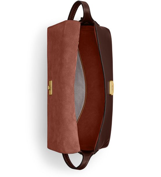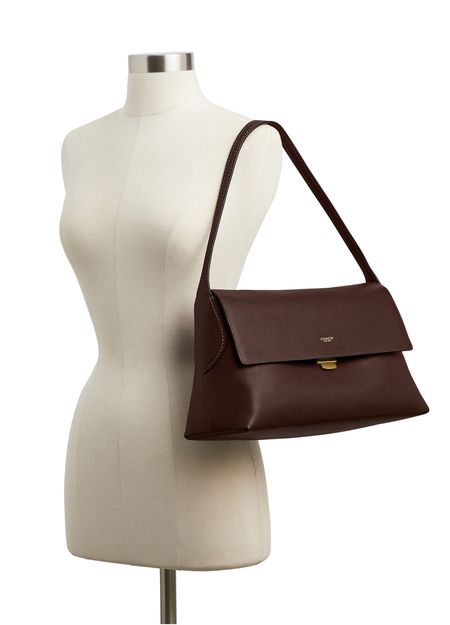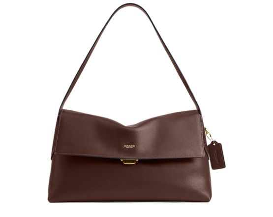 Reveal Coach's medium flap shoulder bag, crafted from smooth leather with a decorative label featuring the embossed Coach logo. Gold-finish hardware and visible stitching highlight its refined design, while a zippered interior pocket and contrast lining add both function and style.