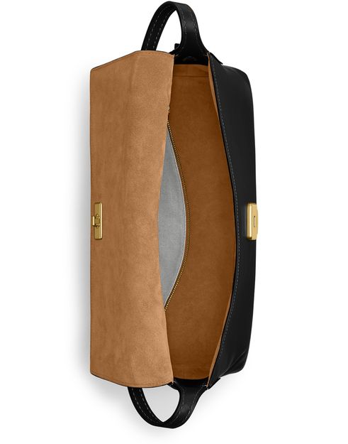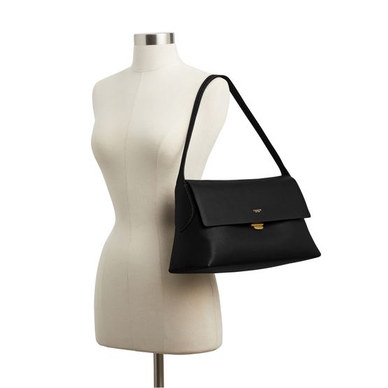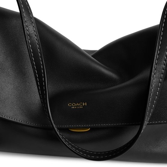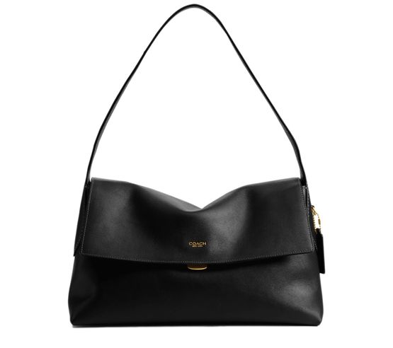 Reveal Coach's medium flap shoulder bag, crafted from smooth leather with a gold clasp and elegant gold finish. The front features an embroidered Coach logo and a decorative label, while visible topstitching and a single handle add refined structure. A zippered interior pocket ensures practical sophistication.
