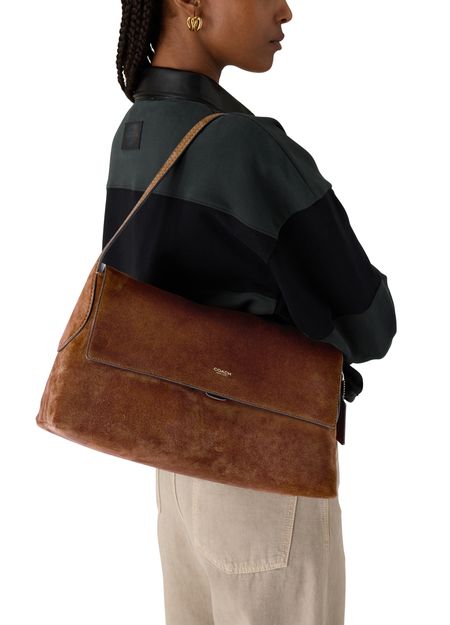 Reveal Coach's medium flap suede shoulder bag, crafted from sumptuous suede and adorned with a decorative label featuring the embossed Coach logo. The gold-finish hardware, visible stitching, and a secure twist lock closure combine with a zippered interior pocket for refined, modern functionality.