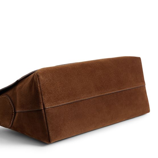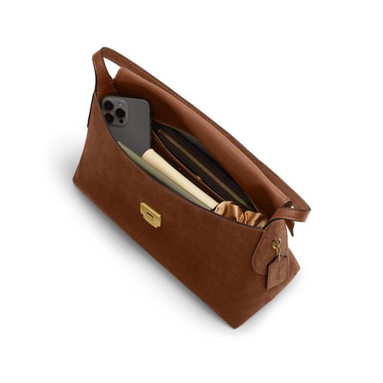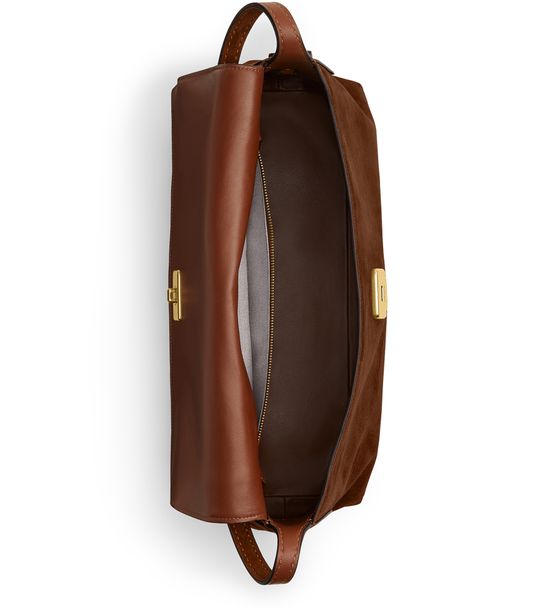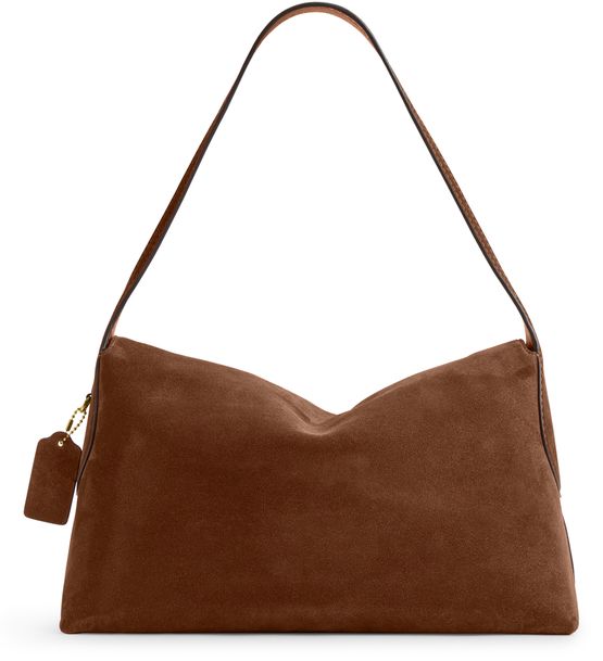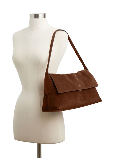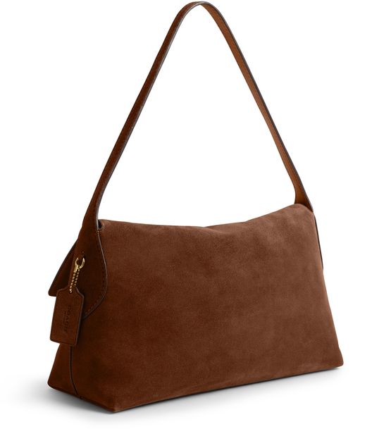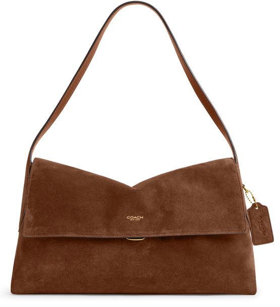 Reveal Coach's medium flap suede shoulder bag, crafted from sumptuous suede and adorned with a decorative label featuring the embossed Coach logo. The gold-finish hardware, visible stitching, and a secure twist lock closure combine with a zippered interior pocket for refined, modern functionality.