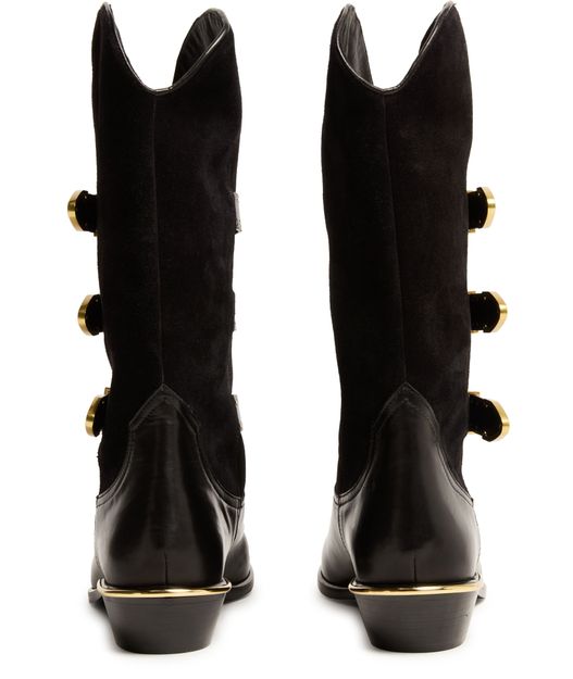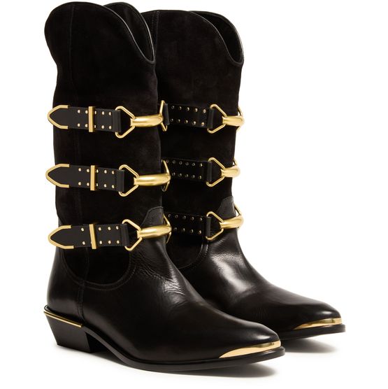 • Description : Boots, smooth leather, block heel, low heel, pointed toe, buckled strap, cowboy boots, visible stitching, metal details in front and back.