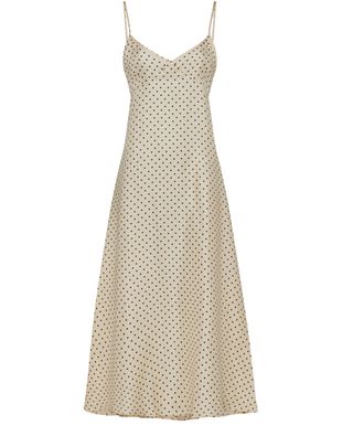 Midi dress is a stunning maxi dress featuring a concealed back zipper closure for easy wear. It boasts a plunging neckline that adds a touch of allure to its elegant design. Adorned with a playful polka dot pattern, this dress is complemented with spaghetti straps and thin shoulder straps, providing a stylish and feminine look.