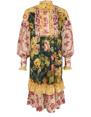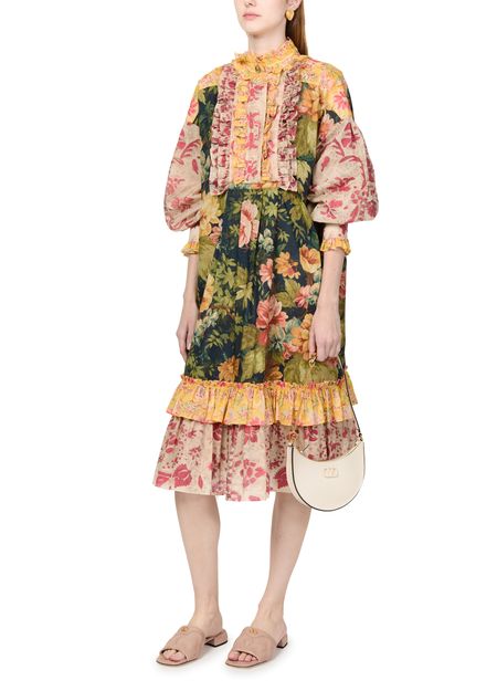 Valentino's Midi dress showcases a stunning floral print in an all-over design. Its high-neck and concealed closure create a sleek silhouette, while the visible stitching adds a touch of elegance. With long cuffed sleeves and ruffle details, this knee-length A-line cut dress is perfect for any occasion.