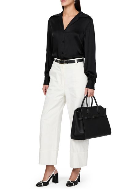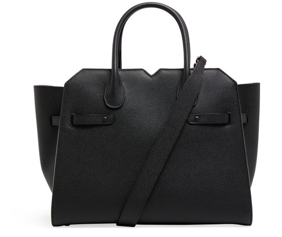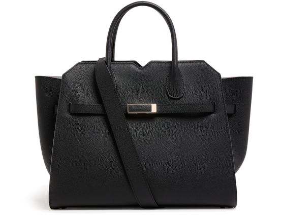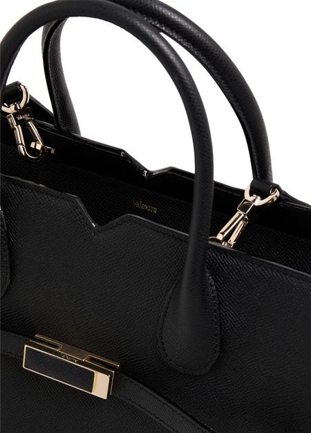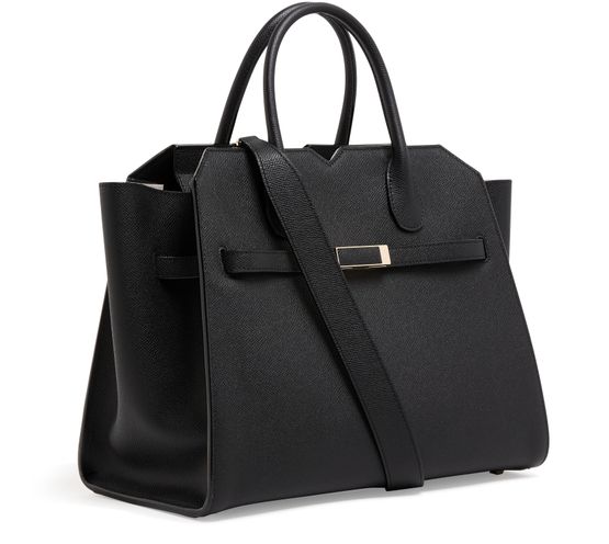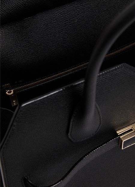 Reveal Valextra's Milano handbag - a masterpiece featuring a gold finish and double handles. Crafted for versatility, it can be elegantly hand-carried or worn crossbody with its thin strap. The visible topstitching adds a touch of refined detailing to this modern accessory.