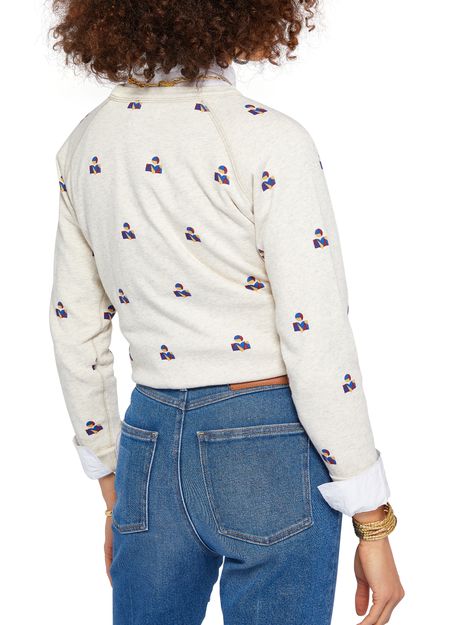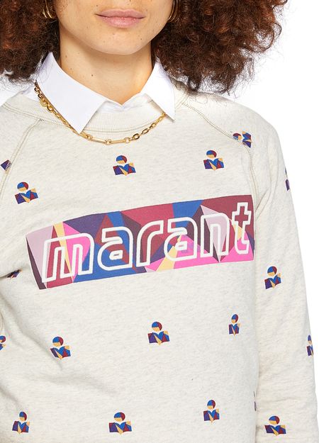 Isabel Marant Etoile Milly sweatshirt is a long-sleeved, round neck sweatshirt with raglan sleeves and ribbed detailing. It features visible stitching and the brand's signature motif, with a logo printed on the front. This stylish and comfortable sweatshirt is perfect for casual wear.