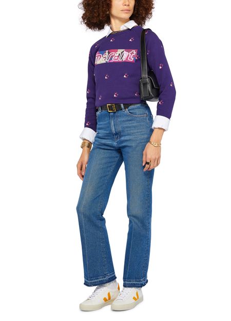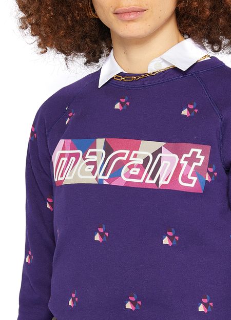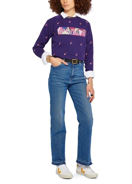 Isabel Marant Etoile Milly sweatshirt is a long-sleeved, round neck sweatshirt with raglan sleeves and ribbed detailing. It features visible stitching and the brand's signature motif, with a logo printed on the front. This stylish and comfortable sweatshirt is perfect for casual wear.